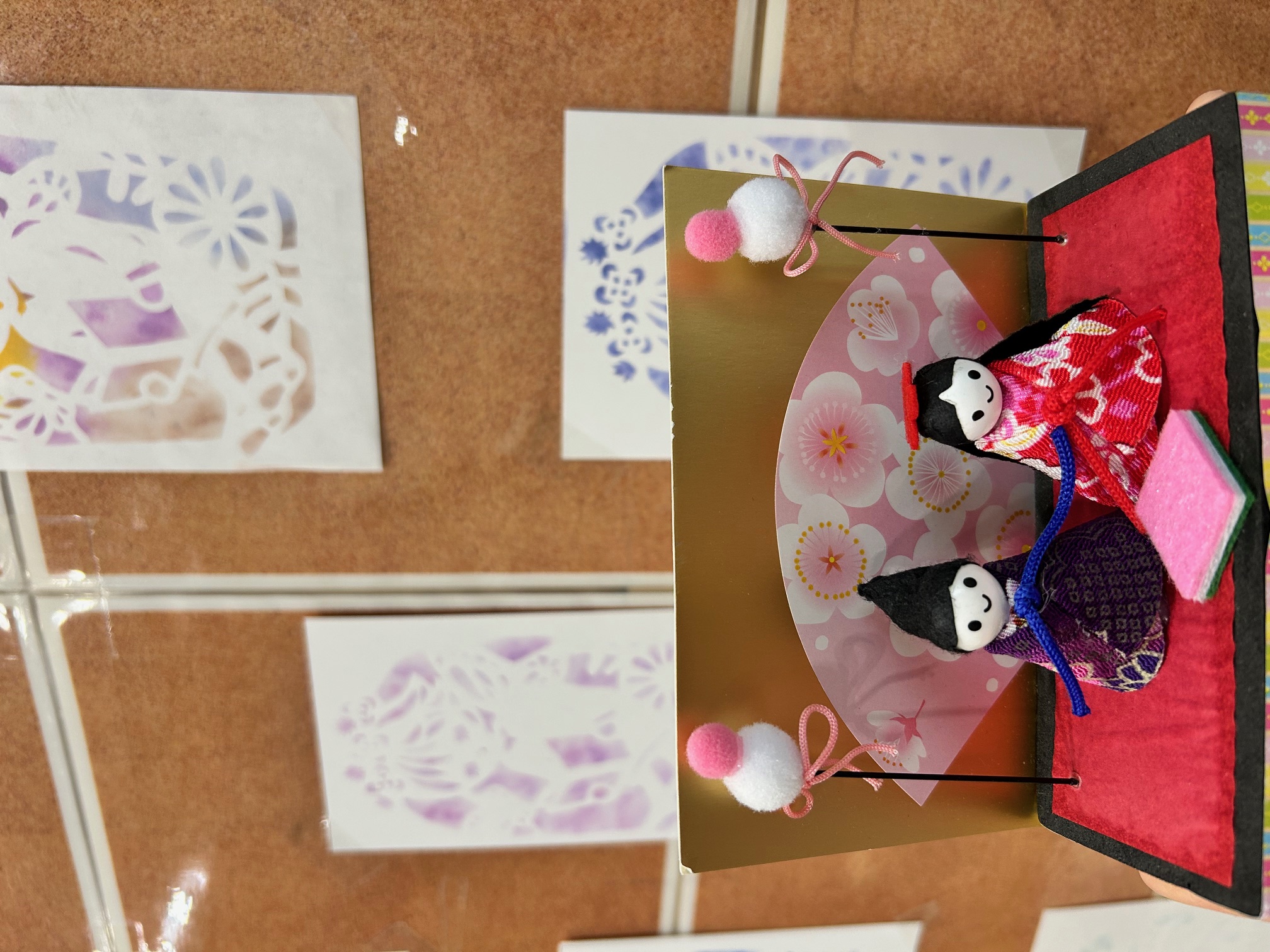 お雛様の飾りとステンシルの作品のおかげで玄関先が華やいでいます