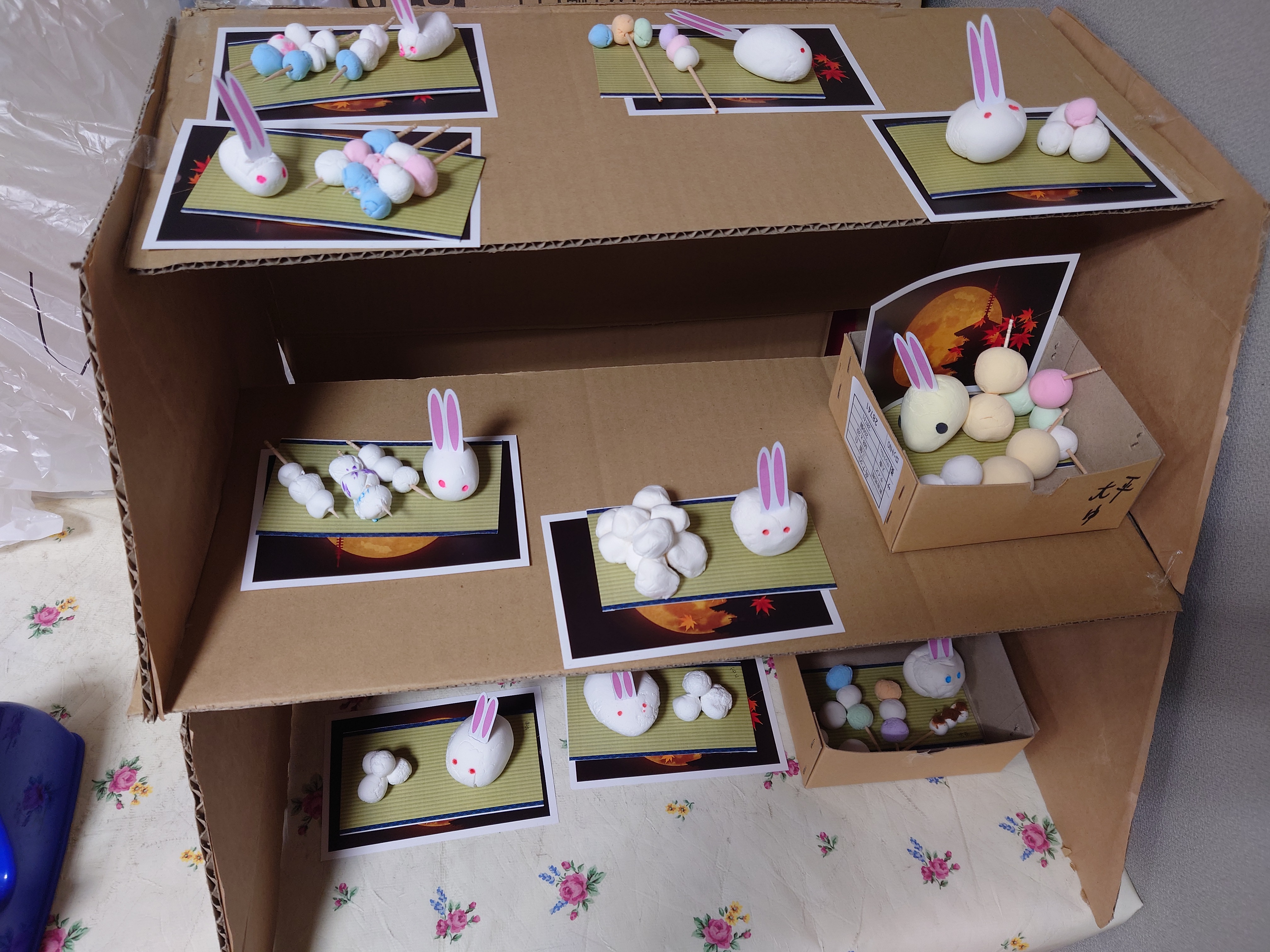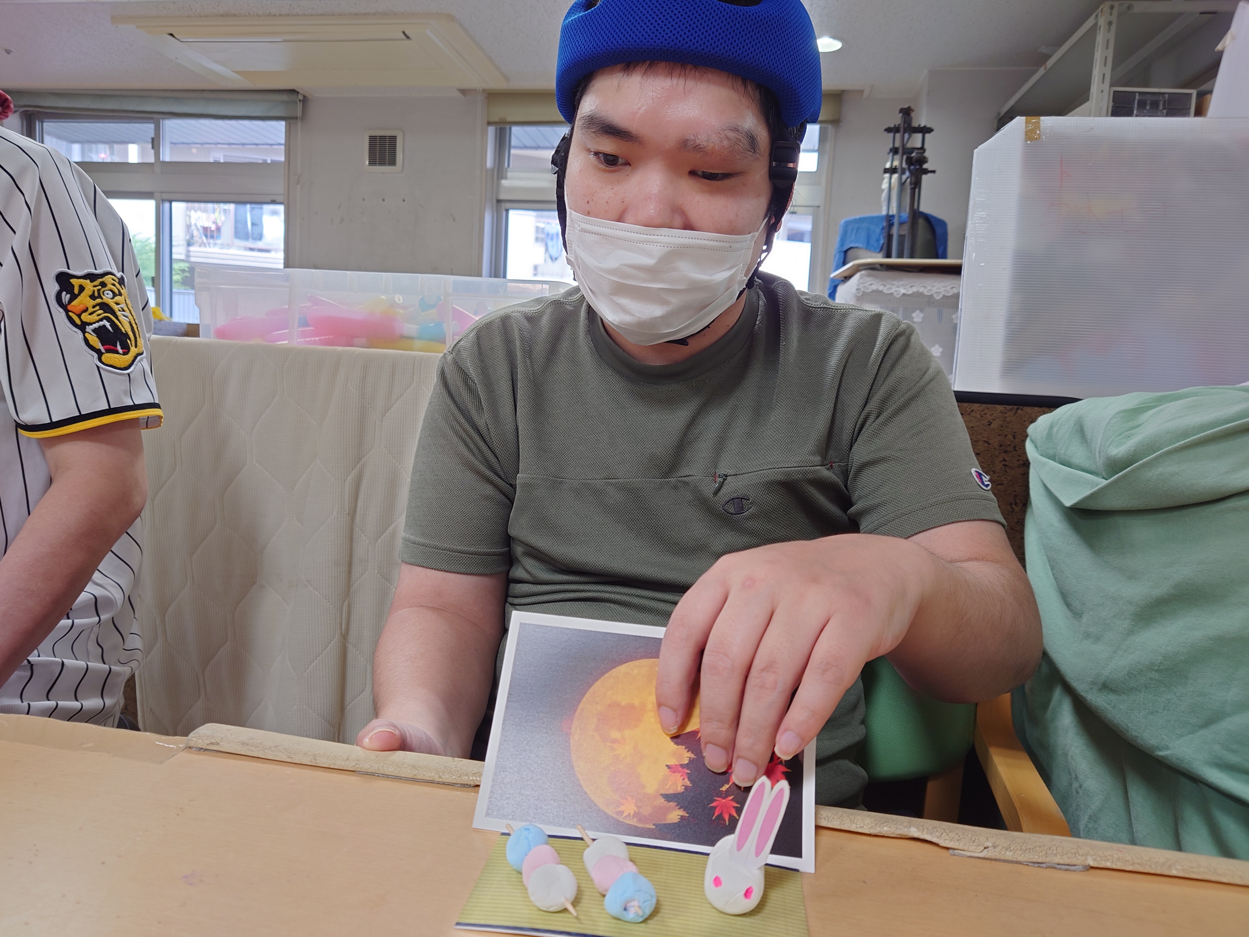 9月の祝日日課はお月見クラフトでした。紙粘土をこねてウサギとお団子を作ります。おやおや、恐竜、ラムネ、これは何?という作品が出てきました。みんな、思い思いに楽しまれていたようです。