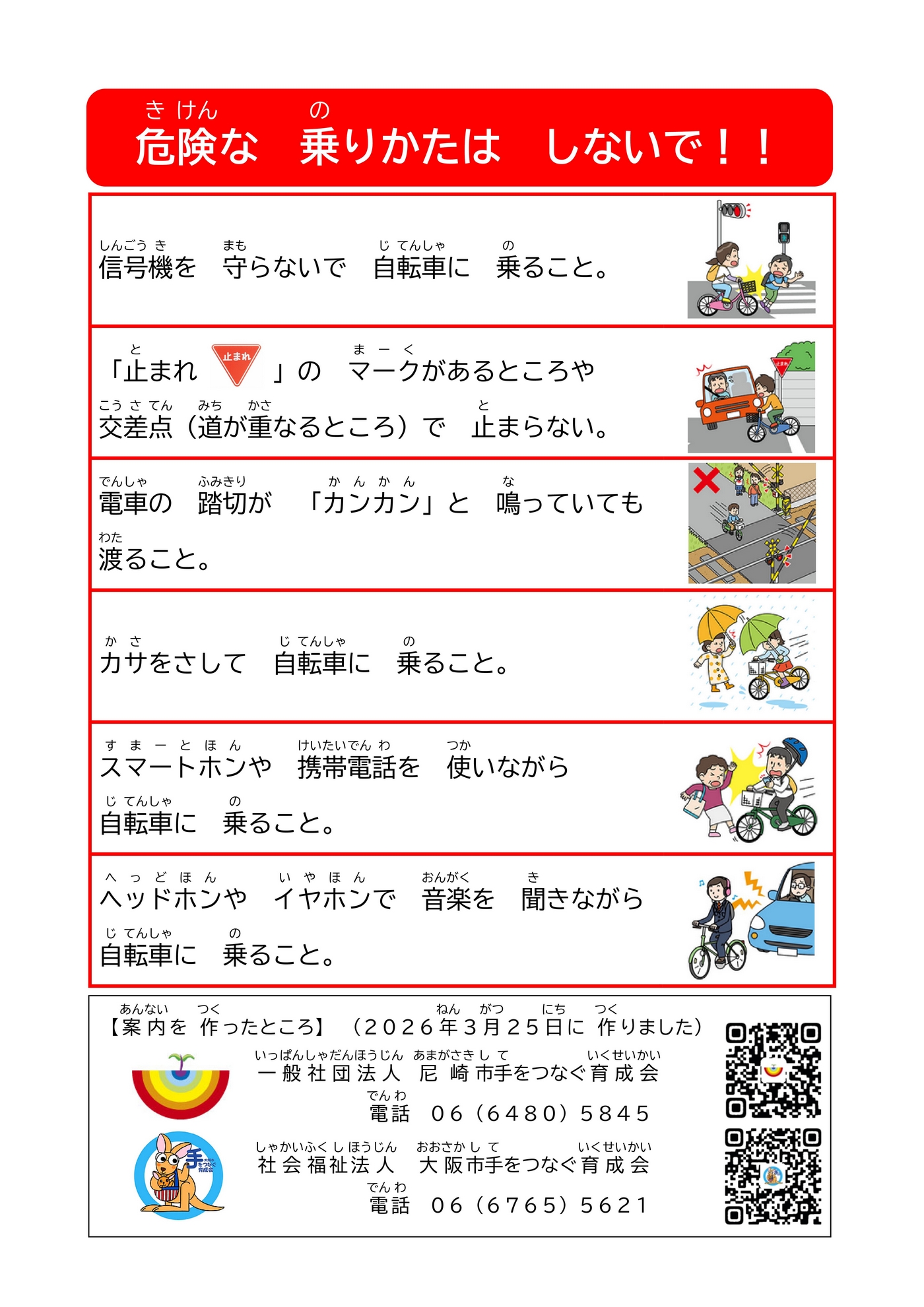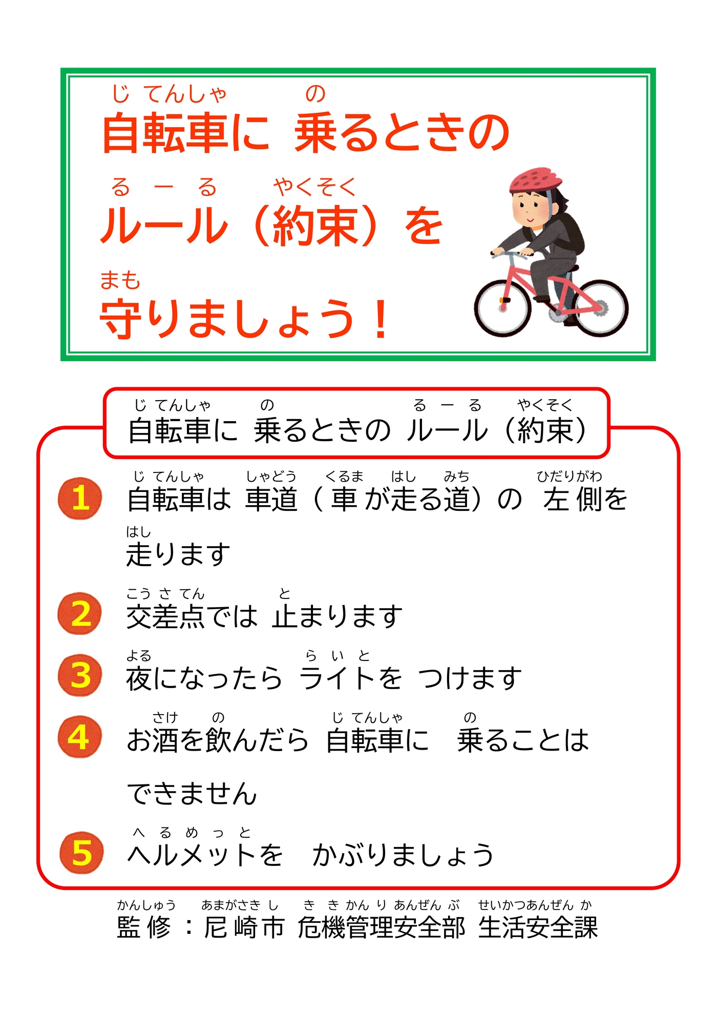 今回、尼崎市手をつなぐ育成会と大阪市手をつなぐ育成会で、知的に障がいのある方などが理解できるように、やさしい日本語を使って自転車に乗るときのルールの案内を作成しました。