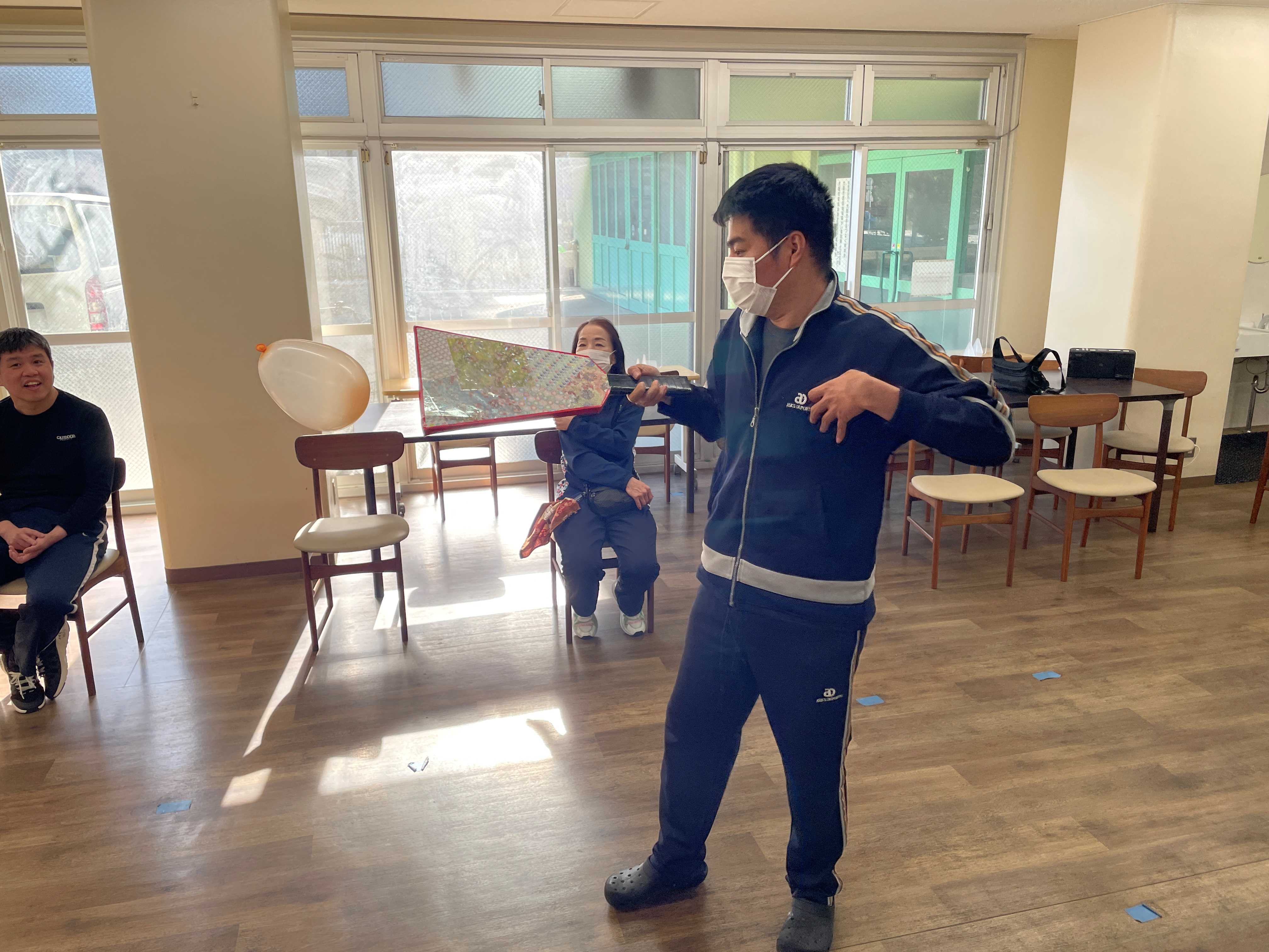 段ボールや牛乳パックで作った羽子板を使って、ふくらませた風船を羽に見立てて打ち合いをされていました。