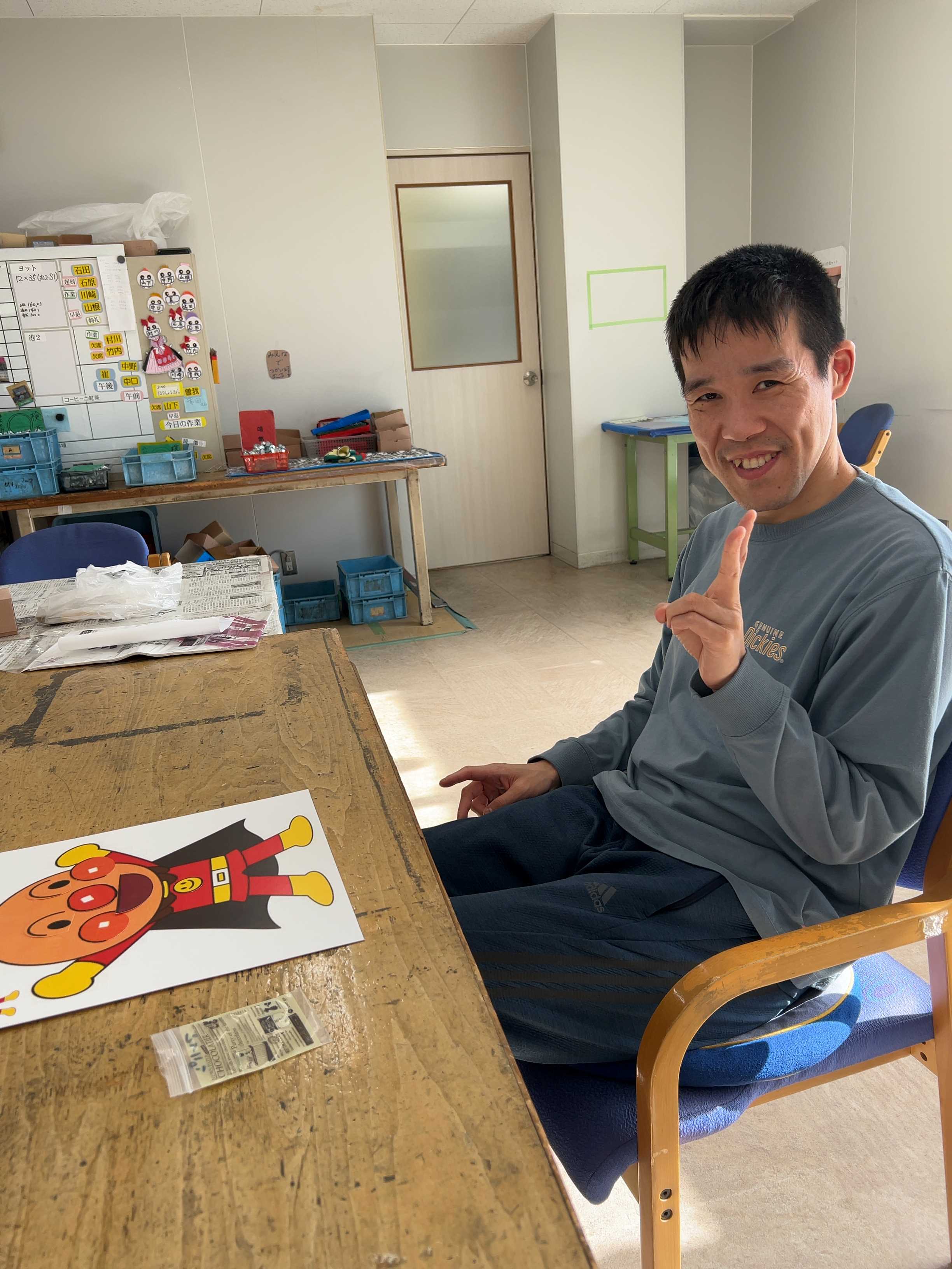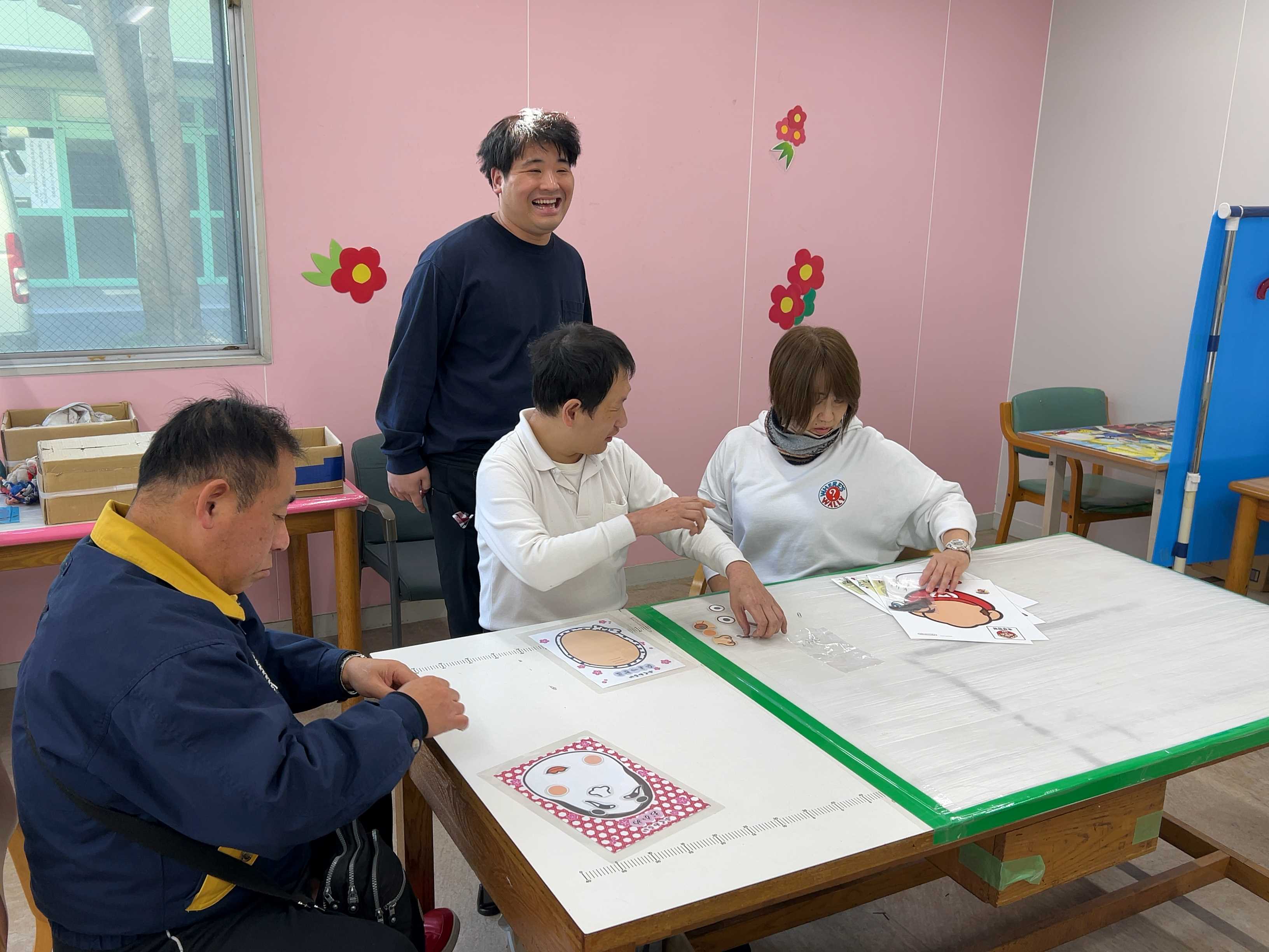 福笑いコーナーでは、アンパンマンのキャラクターやスーパーマリオ、ひょっとこやおかめの顔に、目・鼻・口などのパーツを配置していきました。目を閉じての福笑いに挑戦したり、目を開けたまま置いていったり、またはあえて変顔にしたりして、めいめい楽しんでおられました。すごろくコーナーではキティちゃんのすごろくをしました。手からはみ出るくらいの大きなサイコロを投げてコマを進んだり戻ったり。やっとのことでゴールまでたどり着くと「やったー!」と満面の笑みがこぼれ、大きな達成感を得ておられました。