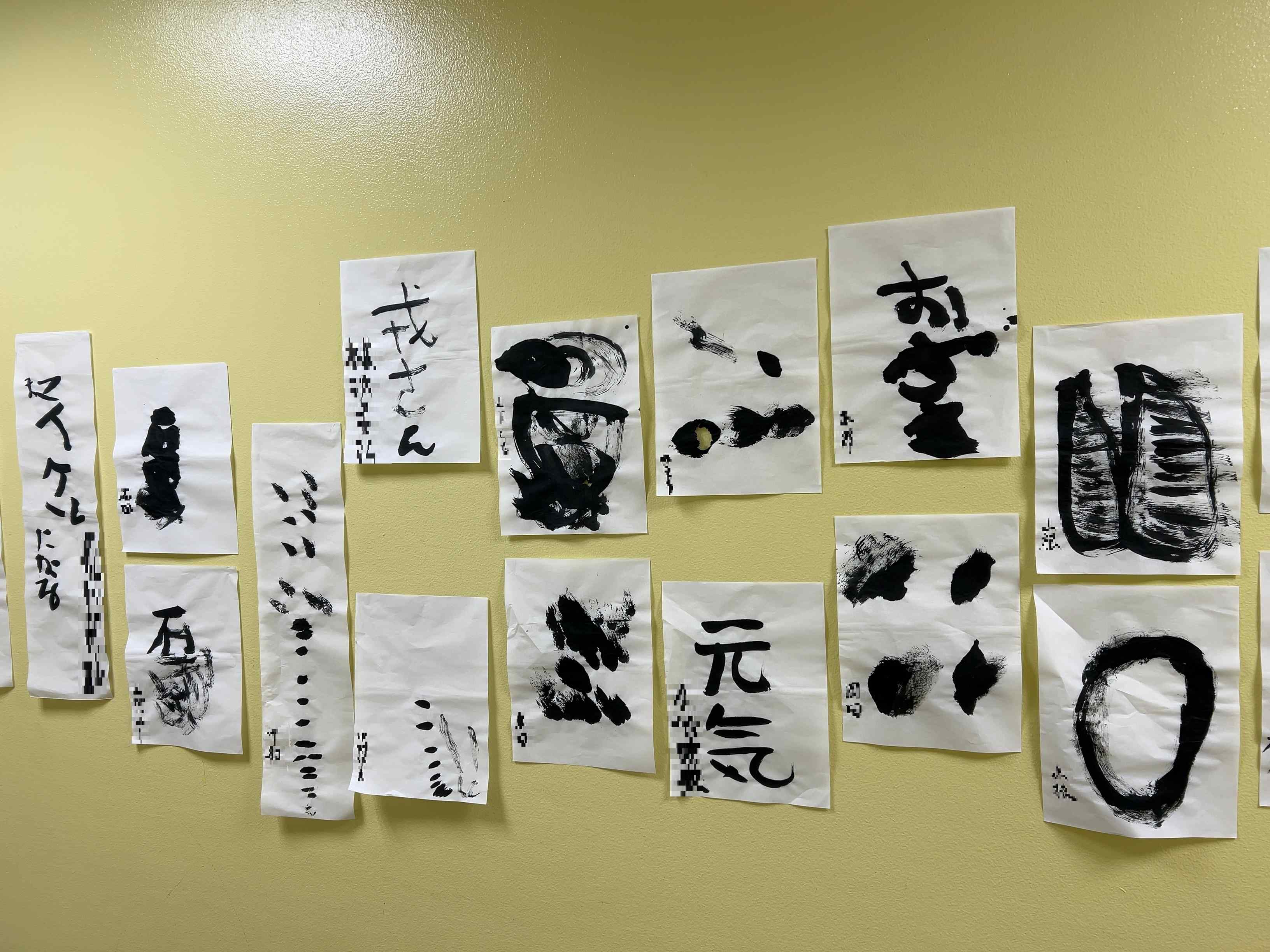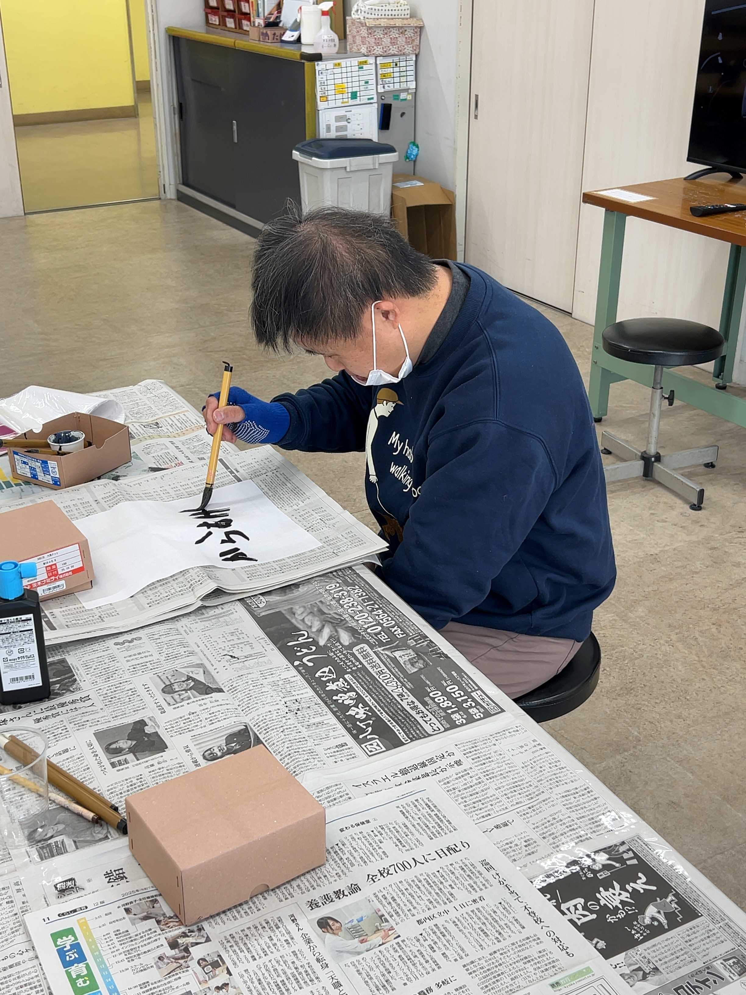 書き初めコーナーでは、みなさん思いつくまま、自由に筆を進めてらっしゃいました。墨汁を浸した毛筆を勢いよく藩士にぶつける方、書きたいものをゆっくり丁寧に書いておられる方、墨のかすれ具合が芸術的である方など、いずれも利用者さんの世界観を見事に表現していました。