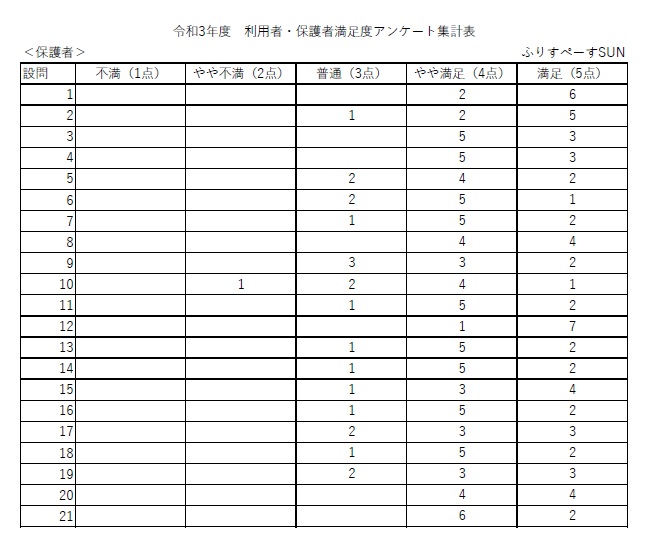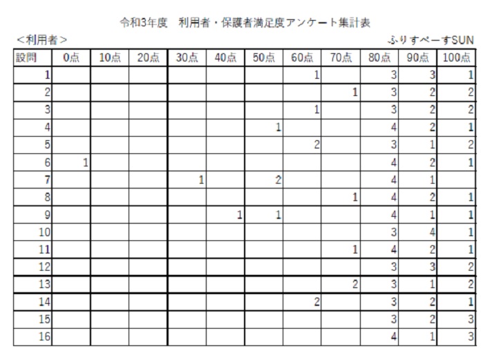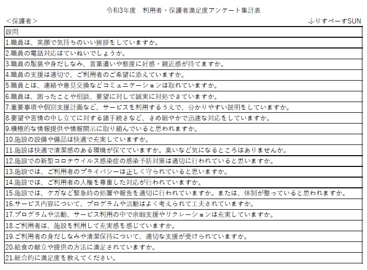 ブログBlog 施設満足度調査結果公表について 投稿日:2021年11月30日 この度、ふりーすぺーすSUNでは、利用者・保護者の皆様に向け、満足度調査を実施いたしました。皆様には、お忙しい中、ご協力いただき誠にありがとうございました。今回の調査結果を、今後の事業運営に生かしていきたいと思います。 前へ次へ 最近の投稿 大阪城ハイキングごくろうさん会グループ外出グループ外出カラオケ大会もうすぐ節分 アーカイブ 2026年 2026年04月 2026年03月 2026年02月 2026年01月 2025年 2025年12月 2025年11月 2025年10月 2025年09月 2025年08月 2025年07月 2025年06月 2025年05月 2025年04月 2025年03月 2025年02月 2025年01月 2024年 2024年12月 2024年11月 2024年10月 2024年09月 2024年08月 2024年07月 2024年06月 2024年05月 2024年04月 2024年03月 2024年02月 2024年01月 2023年 2023年12月 2023年11月 2023年10月 2023年09月 2023年08月 2023年07月 2023年06月 2023年05月 2023年04月 2023年03月 2023年02月 2023年01月 2022年 2022年12月 2022年11月 2022年10月 2022年09月 2022年08月 2022年07月 2022年06月 2022年05月 2022年04月 2022年03月 2022年02月 2022年01月 2021年 2021年12月 2021年11月 2021年10月 2021年09月 2021年08月 カレンダー 2026年4月 日 月 火 水 木 金 土 123456789101112131415161718192021222324252627282930 ←前月 次月→