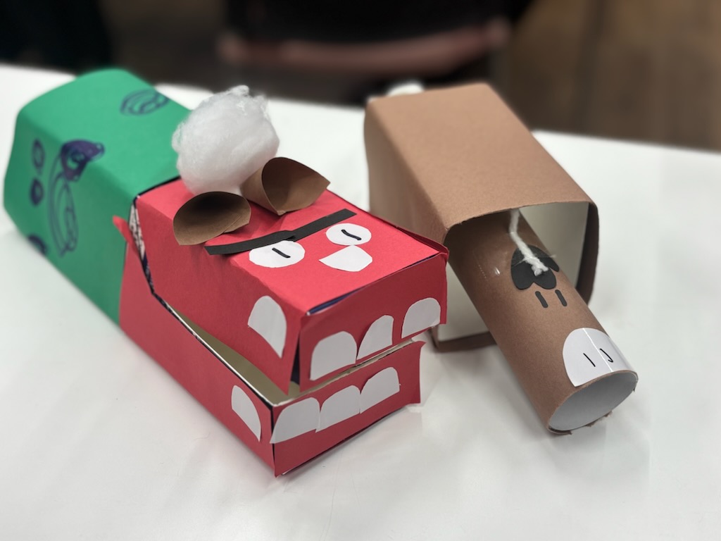 牛乳パックを使って画用紙を貼り付け目玉をつけたりして完成させました。