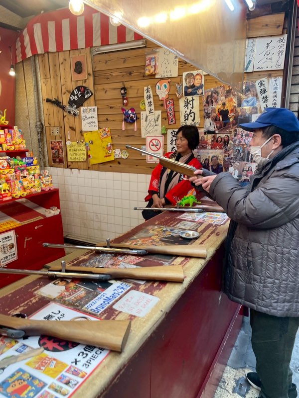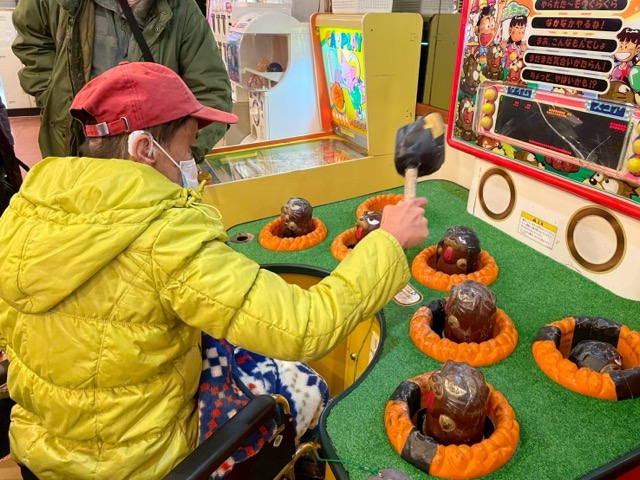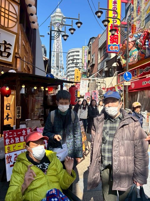 5名の利用者は新世界散策を選んでいます。メンバーでどのように過ごすのか事前に話し合いをしました。新世界と言ったら「串カツ食べる!」とすぐに返答がありました。その流れに乗り「唐揚げ」など食べ物の話題から始まり、食事場所を決める流れとなりました。それぞれ食べたいものの意見が分かれてしまいましたが、お店を調べてみると(大よし)というお店では50種類のメニューが表示されていたのでその店でランチをすることになりました。食事以外ではお土産を買いたいという意見が出ましたが、他は写真などをみてもらいましたが、イメージすることが難しい様子でしたので、散策しながら興味のあるものを見つけたら職員に伝えるようにしましょうということで話し合いが終わりました。当日は天気も良く、恵美須町駅から通天閣周辺のお店に入って好きなお菓子などを買いに行きながら、動物園駅近くにある(大よし)を目指しました。新世界は観光客でにぎわっていましたが、店内は意外と空いていて、写真付きのメニュー表のため、それぞれ好きなものを注文することができました。ごはん、お茶、コーヒーはお変わりが自由のためお腹も十分に満たされてました。食後は再度新世界を散策し、お小遣いの範囲内でスマートボール、射的、ゲームセンター内ではモグラたたきゲームなど昭和時代の懐かしい気分を味わいながら楽しい時間を過ごすことが出来ました。