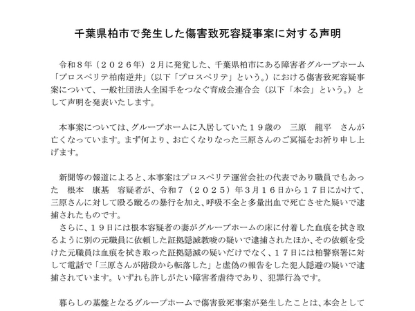 千葉県柏市のグループホームにおける傷害致死容疑事案に対する声明について